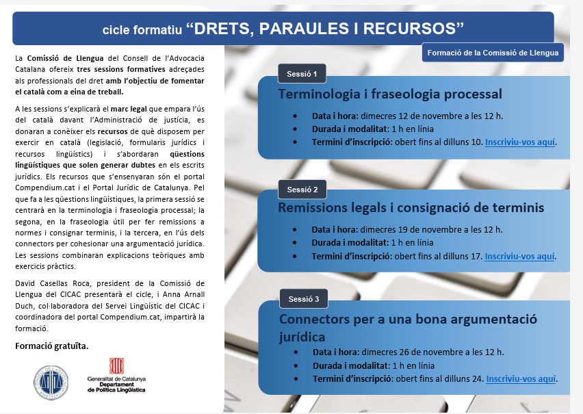 La Comissió de Llengua del Consell de l’Advocacia Catalana ofereix tres sessions formatives en línia i gratuïtes adreçades als advocats i advocades de Catalunya amb l’objectiu de fomentar el català com a eina de treball.
