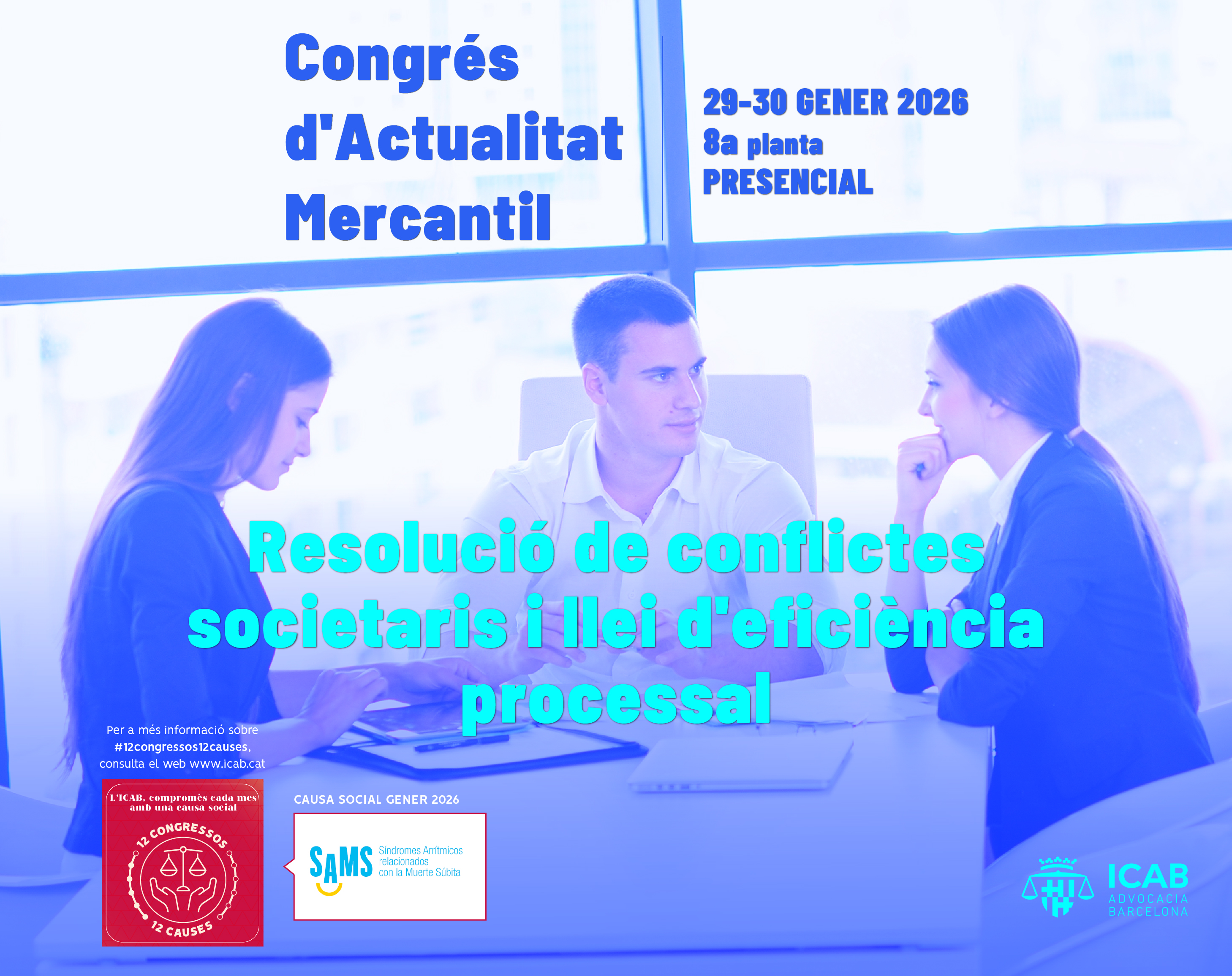 La Junta de Gobierno del ICAB, encabezada por la decana Cristina Vallejo, ha impulsado el proyecto “12 Congresos – 12 Causas”, con el lema “el ICAB, comprometido cada mes con una causa social”, con el fin de poner en valor la función social de la abogacía vinculando los principales congresos jurídicos que organiza esta Corporación con 12 entidades que trabajan desinteresadamente para transformar la sociedad, defender los derechos y mejorar la vida de las personas. En esta línea, el Congreso de Actualidad Mercantil (2026) se ha vinculado con la Asociación de Síndromes Arrítmicos relacionados con la muerte súbita (SAMS), entidad fundada en 2017 por Ángel Quemada, Ester Costafreda, Anna Bertran y Georgia Sarquella-Brugada con el propósito de mejorar la calidad de vida de las personas afectadas por síndromes arrítmicos y sensibilizar a la sociedad sobre la importancia de la detección precoz y la cardioprotección. Cabe destacar además que SAMS ha sido recientemente declarada ----de utilidad pública por el Ministerio del Interior y forma parte de FEDER (Federación Española de Enfermedades Raras), ERN Guard-Heart (Red Europea de Referencia de Enfermedades Cardíacas Raras) y Global Heart Hub (alianza internacional de asociaciones de pacientes con enfermedades cardiovasculares).