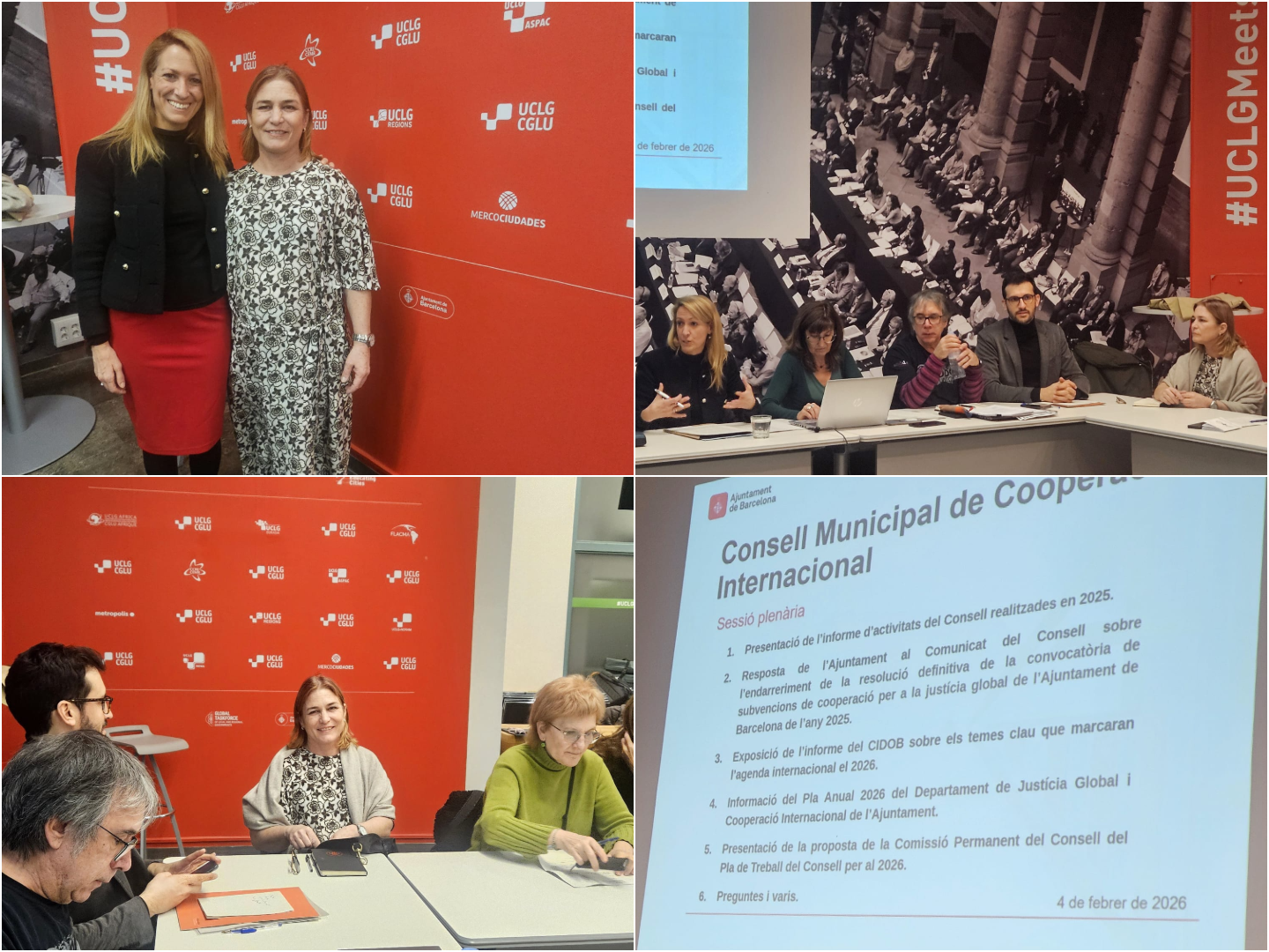 El encuentro ha servido para impulsar el diálogo y la coordinación en materia de cooperación internacional y justicia global, ámbitos en los que trabaja el Consejo Municipal a través de diversos grupos especializados. La reunión se ha llevado a cabo en la Sala CGLU, espacio vinculado a Ciudades y Gobiernos Locales Unidos, red mundial con sede en Barcelona que agrupa a gobiernos locales de todo el mundo.